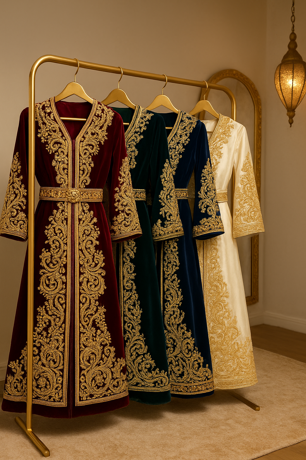Alquiler de caftanes y karakou solo con cita previa. Reserva tu experiencia y elige tu estilo único.